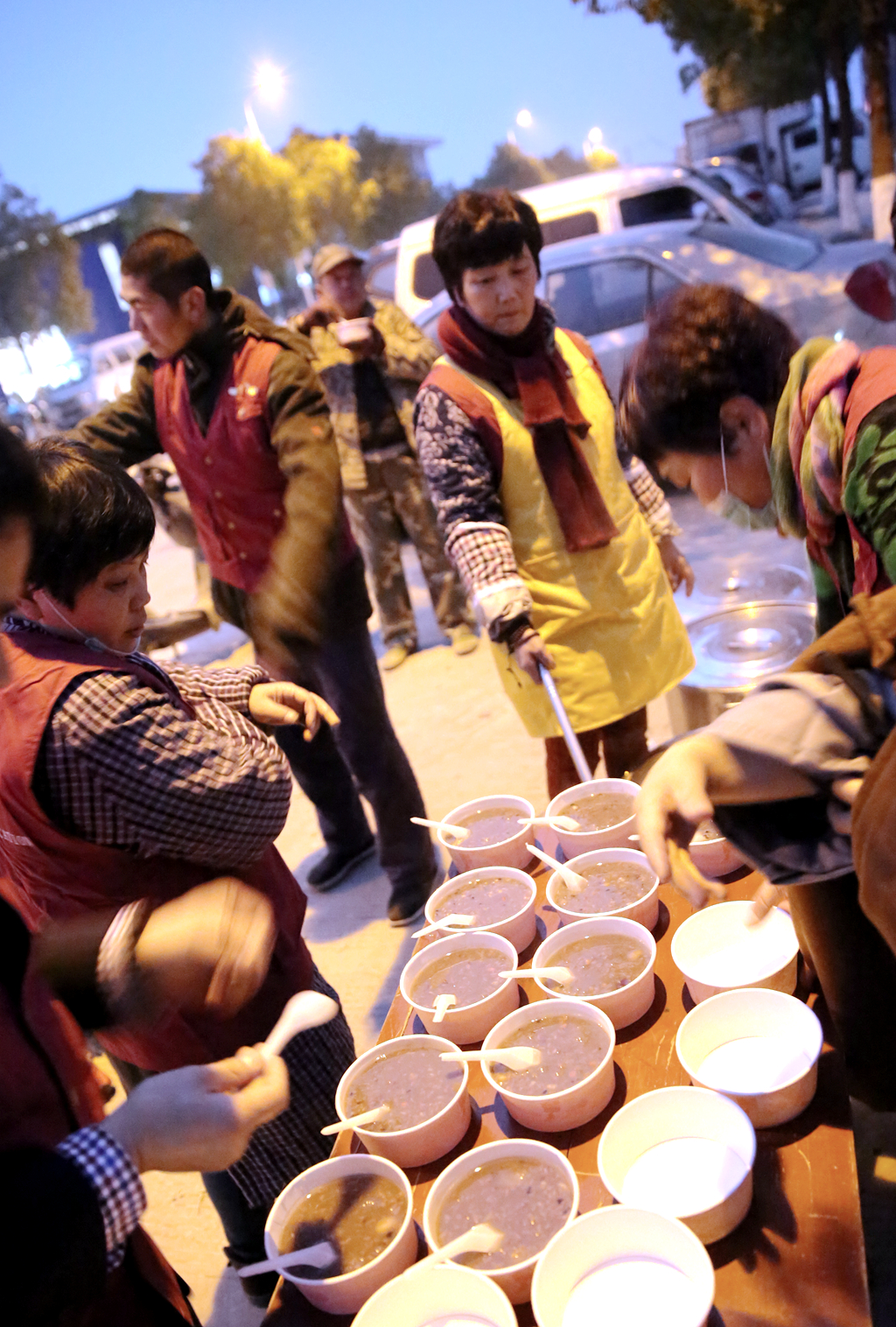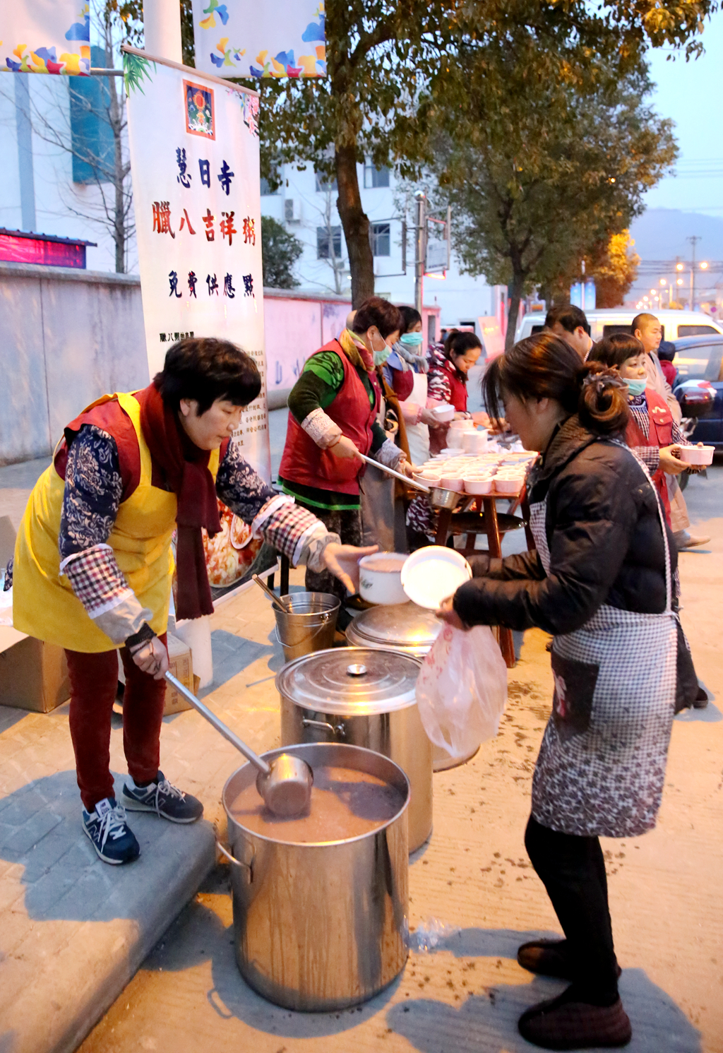 晨光熹微,腊八粥已依次放入碗中,等待有缘人取食。
