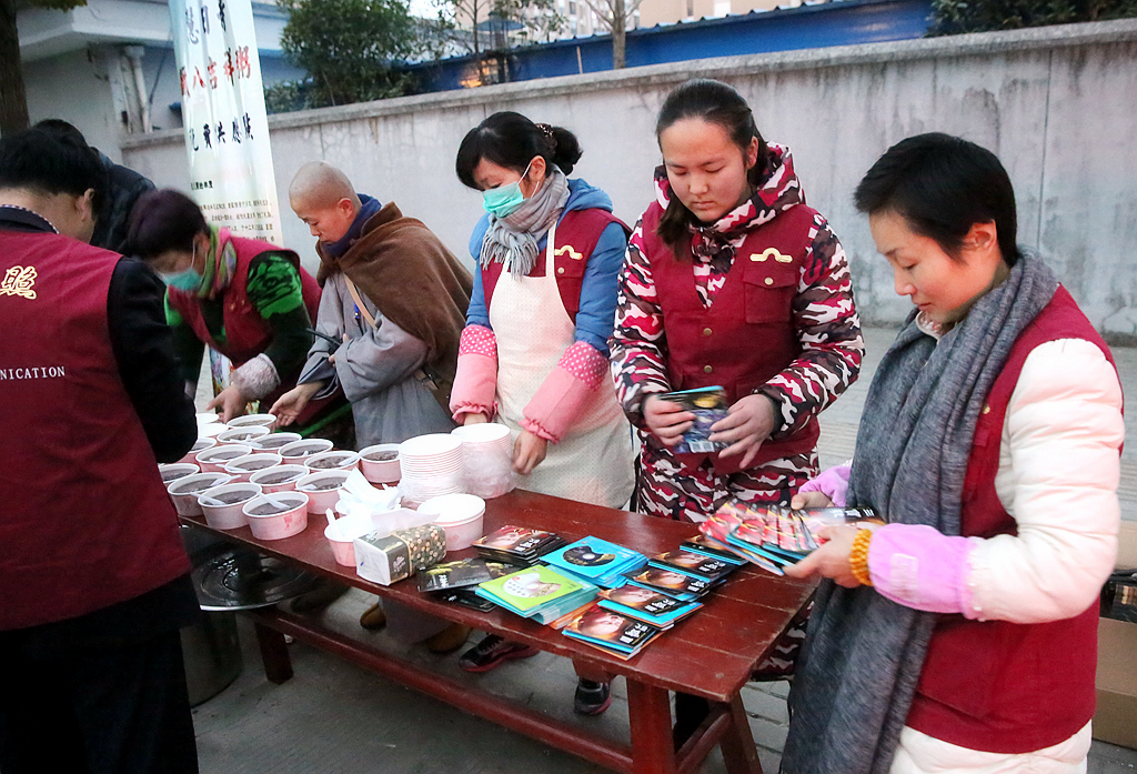喝着吉祥的腊八粥,还得到了免费赠送的讲法光盘,有缘人们不仅收获了美味,还得到精神的食粮。