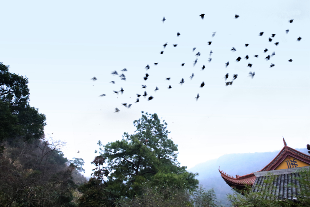 群鸟扇羽,连袂入空,黛山掩映,度脱尘劳。