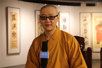 印杰大和尚在书画展开幕前接受南海佛教的采访(图片来源:南海佛教 摄影:顿行)