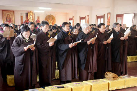 2015年1月8日上午9时,湖北武汉归元禅寺隆重举行传授三皈五戒法会,两序大众迎请该寺方丈隆印法师为皈依、受戒本师。新受皈依弟子、受五戒者百余位。