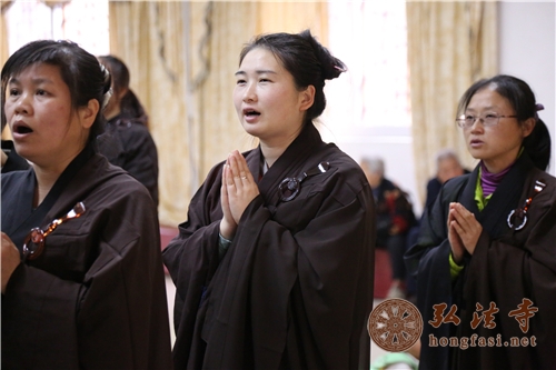 下午1点半,弘法寺经堂,佛光普照,龙天欢喜,钟鼓齐鸣,法音荡涤;信众共同唱诵南无本师释迦牟尼佛的圣号,在维那师的引领下,身着海青的迎请队列捧着香花伞盖,以庄严的威仪和至诚之心恭迎印顺大和尚登堂说法,为信众传授三皈五戒。