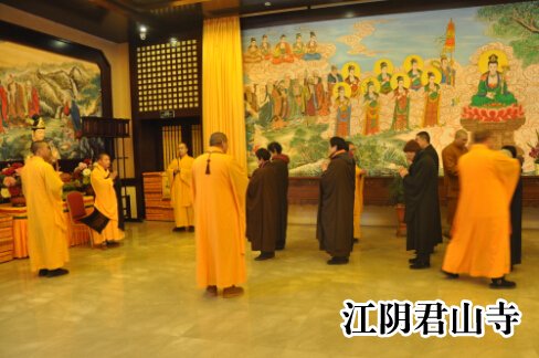 上午9;00,无锡市佛教协会副会长、江阴市佛教协会副会长、君山寺方丈和融大和尚率僧众、护法居士代表至诚迎请苏州市灵岩山寺监院悟戒法师至功德堂讲坛。