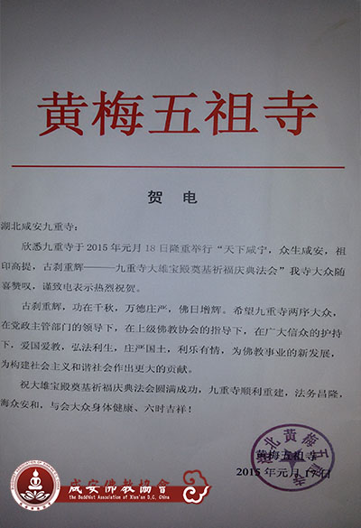 湖北省人大常委、省青联副主席、省佛协会长、五祖寺方丈正慈大和尚发来贺电,并