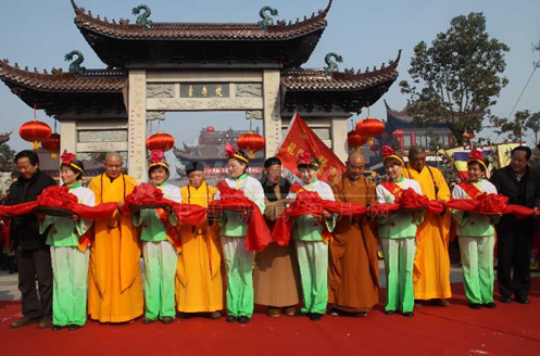 最后,与会领导、大德法师、护法檀越一起为梵寿寺山门牌坊揭幕、为寺院落成剪彩。