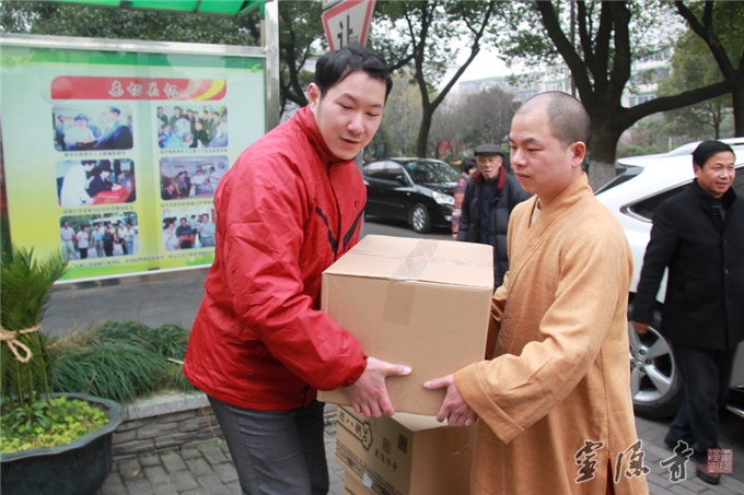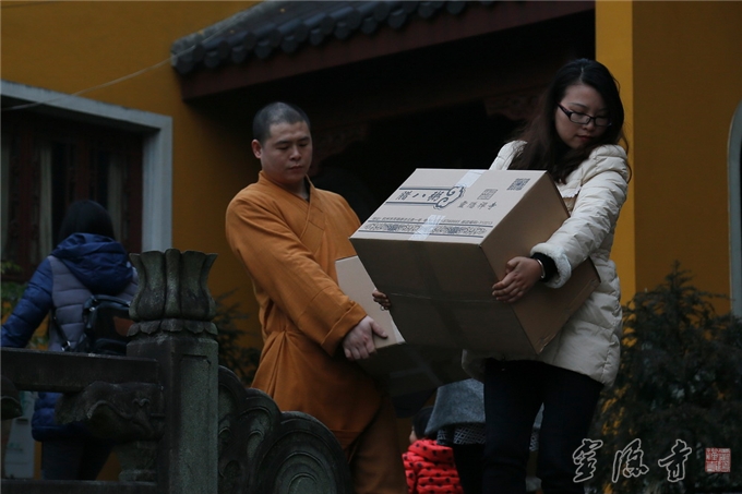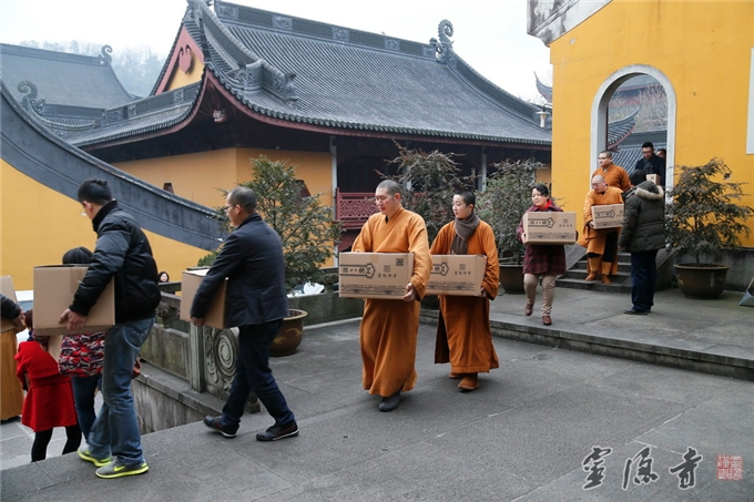 灵隐寺法师和志工们一起搬运腊八粥