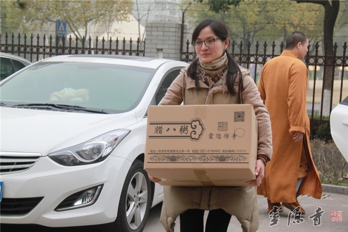 当天是灵隐寺腊八慈善送粥活动的第三天,也是最后一天。由灵隐寺法师和云林志工团义工组成的三个送粥小队,分别前往杭州第一福利院、杭州绿城育华小学、下城区朝晖街道工疗站、笕桥老人公寓等8个地方送粥送温暖,共送出灵隐寺腊八粥约170箱近8000份。