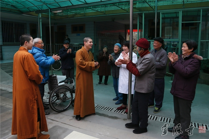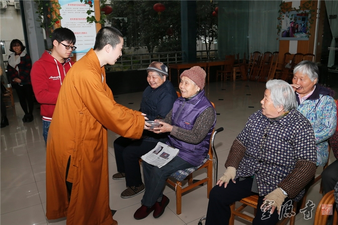 在江干区松龄苑老人公寓,法师们亲手把腊八粥一盒一盒地送到老人们的手中,拉着他们的手嘘寒问暖,并嘱咐他们天冷注意添衣御寒,祝愿老人们身体健康,快乐长寿。老人们手捧着腊八粥,高兴得乐开了花。