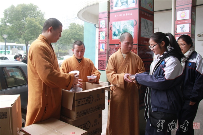 “谢谢,法师……”2015年1月26日中午时分,浙江传媒学院实验中学的学生从灵隐寺法师们手中拿到包涵着新年吉祥祝福的腊八粥时微笑着致谢。
