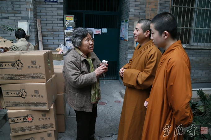昨天,灵隐寺法师和居士们还去了浙江大学老教师宿舍,为这些把全部青春奉献给教书育人事业的园丁们提前送上腊八祝福。年已八十多岁的罗祖煦老师和所有杭城市民一样,喜欢喝灵隐寺的腊八粥,认为喝了灵隐寺的腊八粥,新的一年将会健康、吉祥、如意。她特别感恩灵隐寺法师们亲自将腊八粥送到自己家门口。