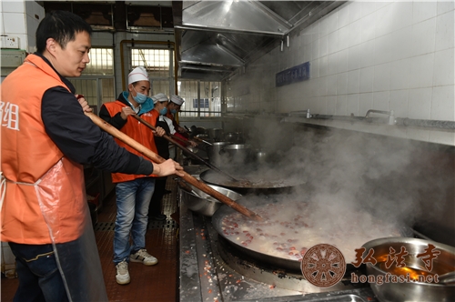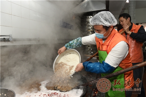 今年弘法寺于深圳地区设立3个施粥点:弘法寺、莲塘街道办施粥处、东湖公园万佛禅寺,先后施粥十万余碗。每年这个时候,弘法寺斋堂的师父和义工们最忙的时候,为了保证粥的质量,斋堂的师父和义工们都是提前几天就开始挑制熬粥的原料。依循传统,腊八粥由斋堂法师亲自调整各种原料比例。据了解,今年的腊八粥采用香米、莲子、桂圆、红豆、花生、核桃、大豆、薏仁、红枣、等食材,精心熬制,寓意着吉祥如意、增福增寿。
