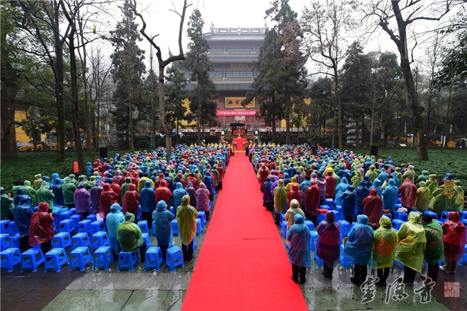 上午9点,仪仗迎请光泉大和尚来到法会现场。法雨淋洌中,钟声梵音悠长,让灵隐寺更添了一份格外的宁静。四众弟子纷纷双手合十,恭敬注目,光泉大和尚礼佛、登法座,展广长舌,演音说法。他从佛陀化身“示现”八种相状(即降兜率、托胎、出生、出家、降魔、成道、转轮、涅槃)度化众生,讲到腊八粥的由来,说明众生都有佛性,只要“时时勤拂拭”,努力修行,去掉妄想、无明,就一定能圆成佛道。