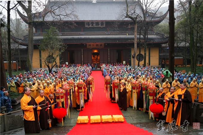 2015年1月27日,农历腊月初八,释迦牟尼佛成道纪念日。为纪念本师释迦牟尼佛成道,杭州灵隐寺在大雄宝殿举行了大型的“甲午年释迦牟尼佛成道日讲经传供祈福法会”,光泉大和尚登坛说法,开示腊八粥的缘起、意义。来自杭州灵隐寺、杭州佛学院的法师们以及八百名信众和随缘来灵隐寺祈福的游客信众同沾法喜,欢天喜地地参加了此次盛会。