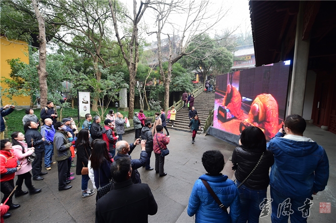 【游客信众通过LED屏观看庄严的祈福法会】