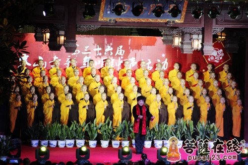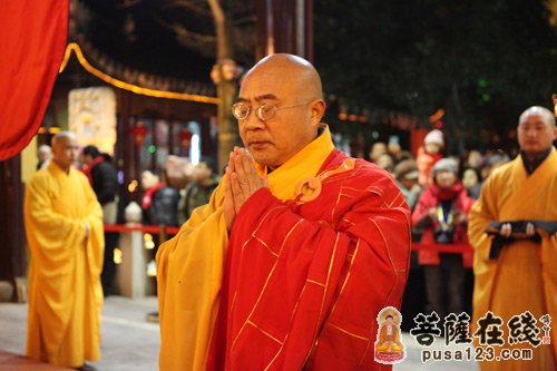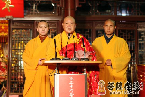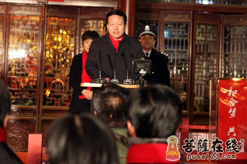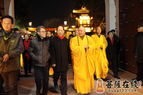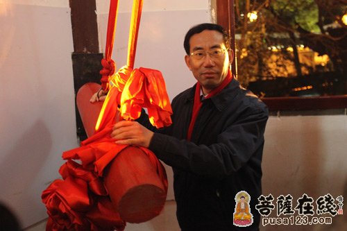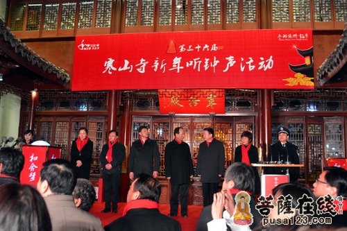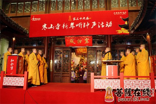 寒山寺方丈秋爽大和尚致辞,代表寒山寺两序大众向各位嘉宾及社会贤达表示热烈欢迎!向关心、支持寒山寺的各位领导和信众表示衷心感谢!他说钟声象征和平,象征和谐,象征平安!佛经云:“闻钟声,烦恼轻,智慧长,菩提增”。愿这辞旧迎新的一百零八响寒山钟声传遍苏州,响彻中华大地,愿佛陀的智慧之光照耀世界的每一个角落。