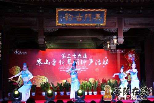 22时,在枫桥景区古戏台上拉开新年梵呗演唱会的序幕,由寒山书院法师及苏州著名弹词表演艺术家邢晏芝领衔,汇集优秀弹词演员所组成的寒山寺“吴歈礼佛”艺术团以清净和雅之音,为大众奉献一场真挚无私、洁净和美的吴歈梵唱。