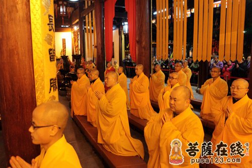 寒山寺大雄宝殿内香云普覆,梵音绕梁,一片祥和,寒山寺众法师在佛前虔诚礼拜,举行庄严的祈福法会。法师们齐声诵经祈愿来宾三宝护佑,在新的一年里家庭和睦,事业和顺,法喜充满、六时吉祥;祈愿祖国繁荣昌盛,世界和平。