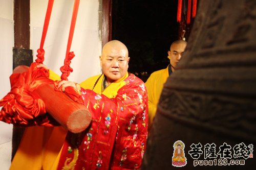 23时42分08秒,秋爽大和尚敲响寒山古钟,雄浑的108钟声回荡寒山内外,回荡海内外的来宾心中,声声祈愿:人心和善、家庭和睦、人际和顺、社会和谐。