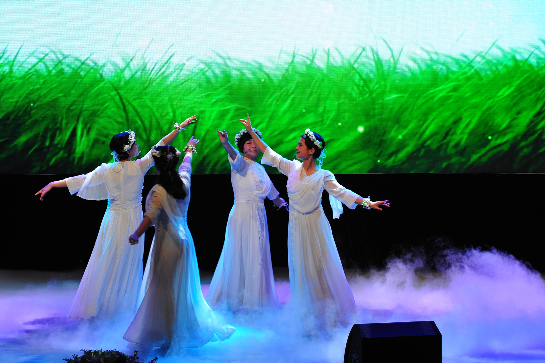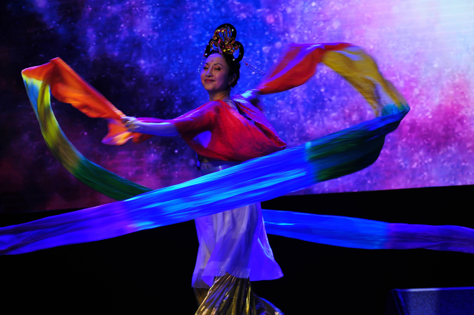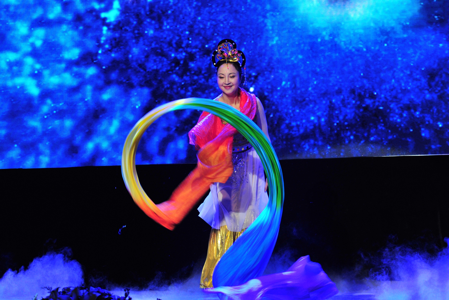 妙证居士表演独舞《飞天》,再现丝路花雨中凌空飞舞的身姿。