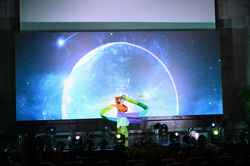 慧日梵呗歌舞团成立于2011年,由妙证居士发心组织,将舞蹈与修行结合,期待在舞蹈中净化烦恼,生出欢喜,与自心建立联结。她们的服装和道具都由自己来设计和缝制。这次她们带来了舞蹈《六字真言颂》。