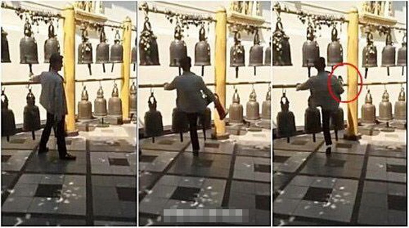中国游客在泰国脚踢古寺铜钟遭泰网友讨伐(视频截图)