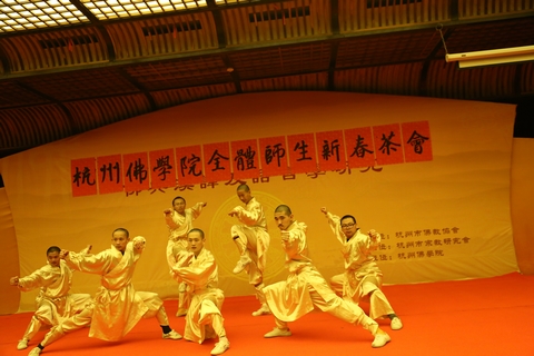 2015年1月25日下午,在杭州佛学院法云校区禅堂举行了杭州佛学院全体师生新春茶话会。杭州佛学院教理院、艺术院、女众部,以及青年学佛班的唯识班、天台班、华严班与基础班的三百多名师生出席了茶话会。杭州佛学院院长、灵隐寺方丈光泉法师亲临现场出席了茶话会。青年学佛班学员李达居士主持茶话会。