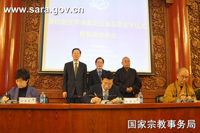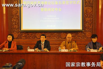 3月15日下午,《第四届世界佛教论坛工作备忘录》签字仪式暨第四届世界佛教论坛新闻发布会在国家宗教事务局银安殿举行。备受海内外佛教界瞩目的第四届世界佛教论坛,将于2015年10月下旬在世界佛教论坛永久会址——江苏省无锡市灵山胜境举办。论坛由中国佛教协会和中华宗教文化交流协会共同主办,第四届世界佛教论坛江苏组委会承办。中华宗教文化交流协会会长王作安、江苏省人民政府省长李学勇、中国佛教协会副会长嘉木样·洛桑久美·图丹却吉尼玛出席并见证了签字仪式,中华宗教文化交流协会副会长兼秘书长蒋坚永、中国佛教协会副会长学诚法师、第四届世界佛教论坛江苏组委会负责人、江苏省人民政府副省长许津荣签署了论坛备忘录并发布了论坛相关信息,中华宗教文化交流协会副秘书长肖虹主持新闻发布会。