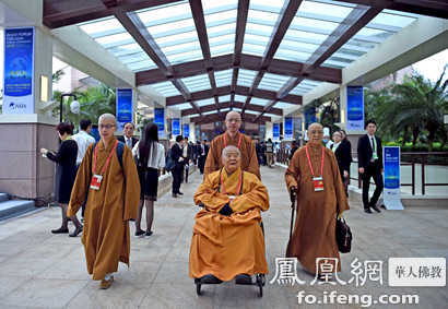 年近90岁的星云大师坐着轮椅,由弟子慈容法师、慧宽法师、妙光法师等人,陪同进入会场,大会亦贴心安排轮椅推到合照台上,让星云大师休息,不过大师坚持走上合照台阶,等候习主席的到来,其精神毅力,正如他一生契而不舍,推动平等与和平的坚持,令与会人士赞赏不已。