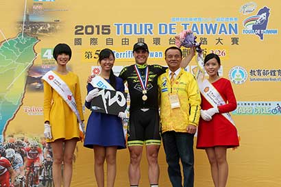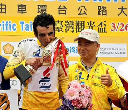 伊朗选手波尔赛迪格克豪(M.Pourseyedigolakhour)则夺得代表亚洲最佳车手的蓝衫、个人总冠军的黄衫与代表登山王的红点衫,赢得三冠王宝座的他也兴奋地在台上亲吻奖杯。(图片来源:凤凰佛教 摄影:人间社)