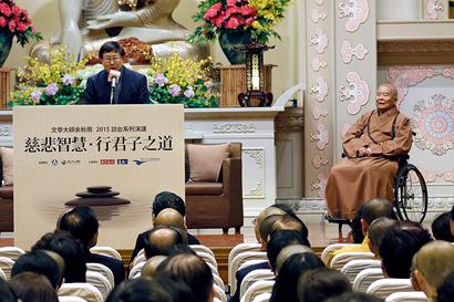 星云大师全程聆听余秋雨演讲。(图片来源:凤凰佛教摄影:妙开)