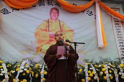 上午九点半追思赞颂法会由汉中市佛教协会副会长兼秘书长本光法师主持,哀乐缓缓响起,全体人员向长老遗像三问讯。汉中市佛协常务副会长马忠清宣读各地唁电、唁函,续学大和尚介绍源公生平,增勤会长代表诸山长老深切致辞,赞扬长老乃陕西高僧,一生爱国爱教,正信正行,精进修行,度众无数,佛弟子楷模。市民宗局张芳副局长代表党委政府讲话,对源老的一生高度评价。法幢寺住持续法法师代表长老本门弟子致答谢词。
