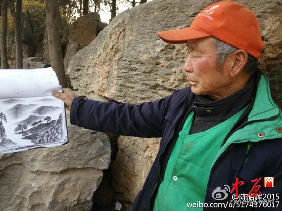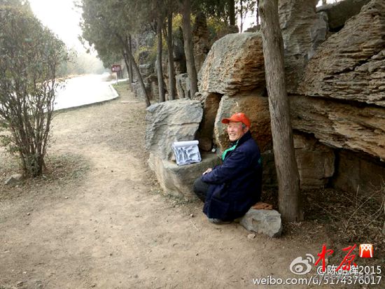 3月7日,大学生小陈和朋友到少林寺游玩,下山的小路上,他看到一位身穿环卫服装的大爷正坐在石头上画画。