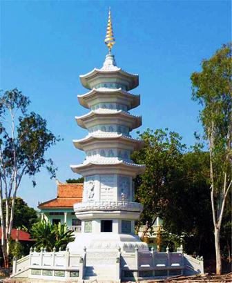 位于柬埔寨金边的波莱波廊寺的本焕塔--仿隋代风格的纯花岗岩石结构,塔刹采用柬埔寨南传佛教风格的铜制镂空雕花相轮,堪称中柬汉传与南传佛教风格的完美结合(图片来源:凤凰佛教 黄夏年提供)