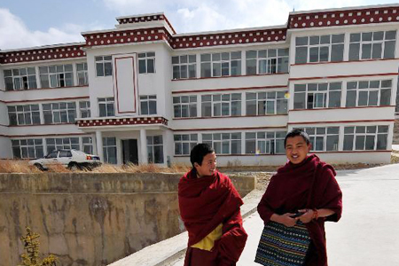 这是学僧诺桑扎巴(右)准备和同学一起去上课,身后是他们的藏式宿舍楼