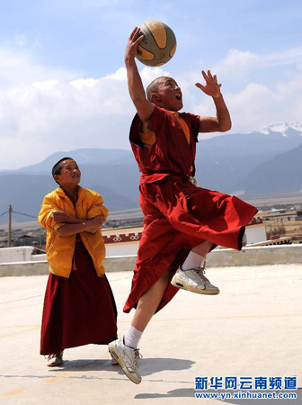 这是学僧格温恩珠(右)和伙伴儿在打篮球