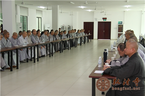 接着,大和尚提到了几天前海南省省委副书记李军代表海南省委考察了本焕学院的情况。他表示,李军副书记一行的考察,希望借助本焕学院成功办学的例子为南海佛学院带去一些借鉴经验,这也表明了本焕学院作为国家级佛学院,在一定程度上代表了中国佛教未来的希望和未来。大和尚告诫大家,选择一座城市,就是选择一种归宿;选择一所学院,就是选择一种未来。愿力决定一个人的世界,个人的信心可以超越一切困难和苦难,希望大家一定要发大愿力,这样才能成就自身的一切。