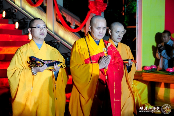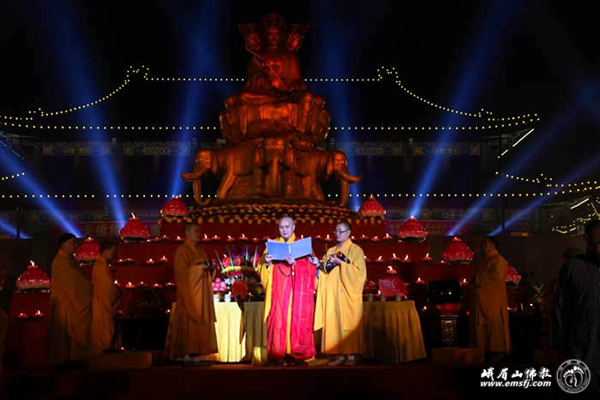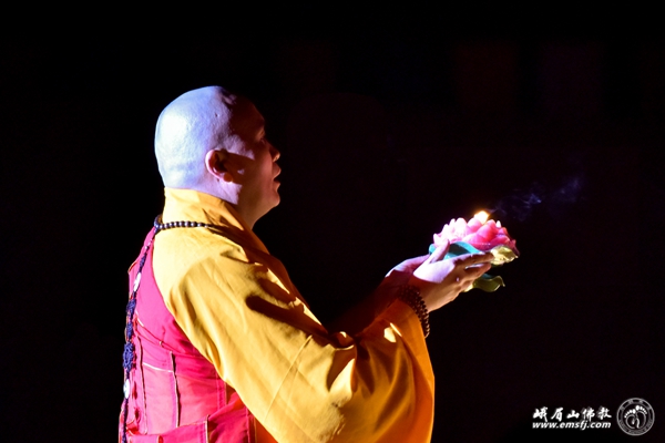 晚八时,前山门广场已是万众云集、灯火辉煌。会场中央由数十盏燃起的巨大莲灯形成一座圆形法坛,法坛中央的方形金刚座上,高高供奉着四面普贤菩萨圣像,庄严而神圣。随着主持人宣布法会开始,山门殿大门徐徐拉开,法师们在音乐声中款款而出,行入供灯祈福法会的主法坛场。