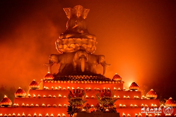 2015年3月4日(农历正月十四)晚,由峨眉山佛教协会主办的羊年元宵“万盏明灯供普贤”大型祈福供灯法会在峨眉山大佛禅院前山门广场隆重举行。