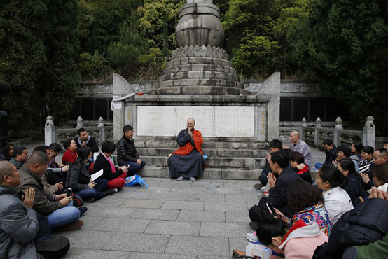 最后传喜法师在舍利塔前,为众念诵《六祖坛经》精华“无相颂”,并就经中两则公案,在禅宗祖庭,阐发如来禅意。