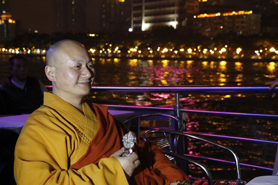 3月16日晚,信众祈请传喜法师夜游珠江,加持广东的母亲河。传喜法师领众念诵《大吉祥经》,《利益龙族名号》,《十万诸佛名号》,祈福珠江流域,法水长流,众生于生死苦海中发出离心,享法喜禅悦,得清净自在。