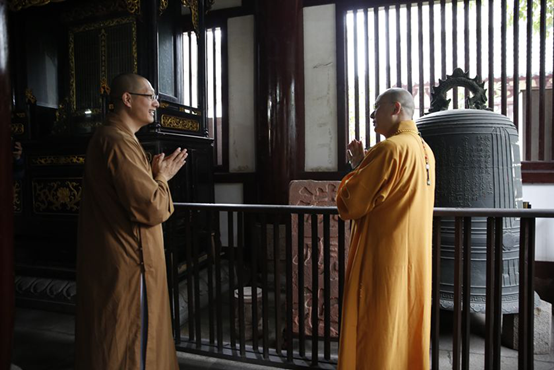 传喜法师与寺院当家师父明海法师交流禅宗修行之道,回忆佛源老和尚家风,互勉互励。