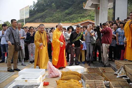 3月20日是世界无肉日,又恰逢日全食,上午,应广东省大亚湾清泉古寺住持上昌下平大和尚及深圳信众的虔诚祈请,传喜法师主持放生法会。