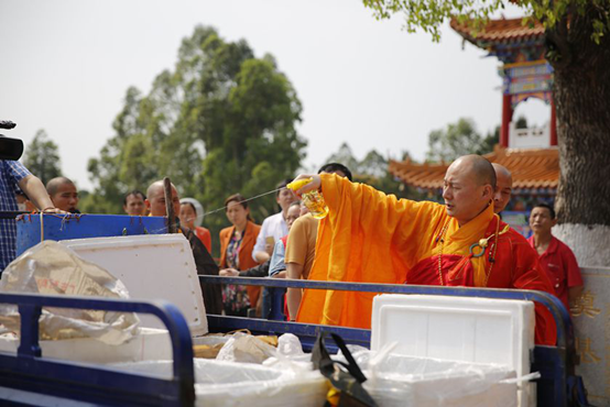 3月18日上午,应广东鹤山海会寺住持上常下俊大和尚邀请,传喜法师主持《祈福广东》慈悲放生法会。