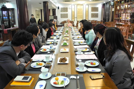 中午,学员们在装饰一新的西林素斋过堂用斋。“过堂”即佛门中的“吃饭”,是中国汉传佛教丛林中特有的仪制,是出家人五堂功课中的两堂,也是一宗重要的日常佛事和功课。过堂用斋看似简朴,却蕴含了严格的礼仪和深远的传统。学员们跟随法师在长桌前念诵“供养偈”「供養佛,供養法,供養僧,供養一切眾生。」一声声虔诚的念诵,真的好美,又好有仪式感,法师也是希望用这种具有仪式感的活动方式,来表现佛教的文化,从而启发世人更多的惜福和感恩之心。用餐时,西林素斋别具一格的长桌分餐,一道道精致的功夫素食,让人目不暇接,印象深刻,流连忘返,大家纷纷向法师素要斋堂订做电话,以备后用。