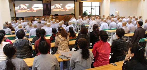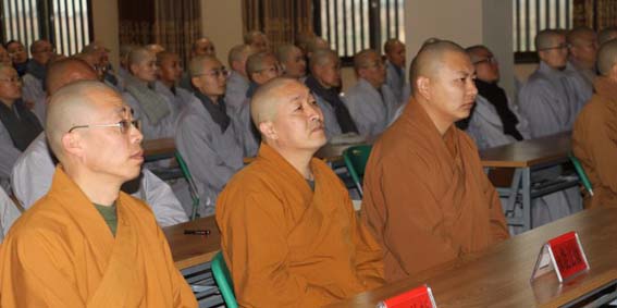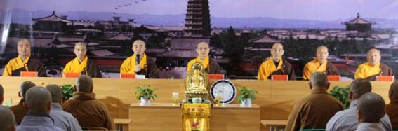 全体师生首先观看了记录短片《龙泉之声2014》,接着全体起立合掌齐唱了法门寺佛学院院歌《播洒大爱》。随后常务副院长贤空法师作了主题发言。