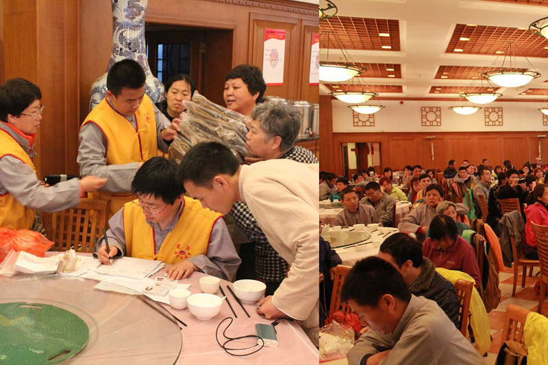 义工组的居士更是早早来到集合地点,为大家做着各种准备:发放朝山的背包和居士服雨披等用品;安排入住房间;布置开示交流的会场......