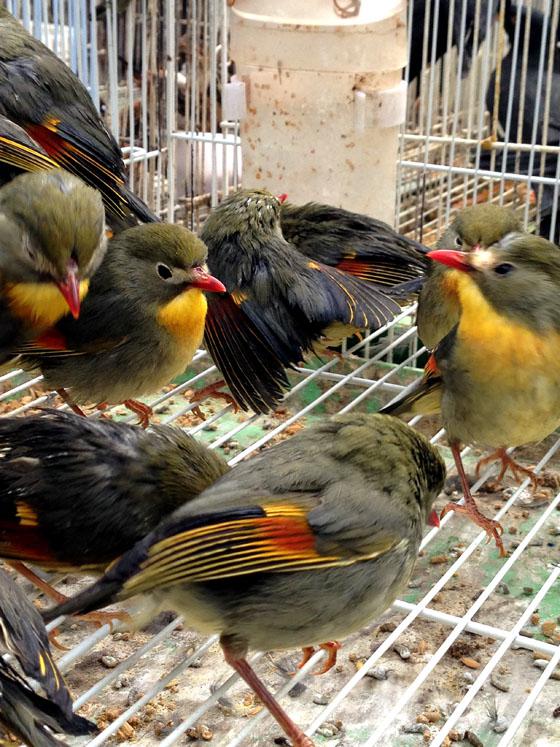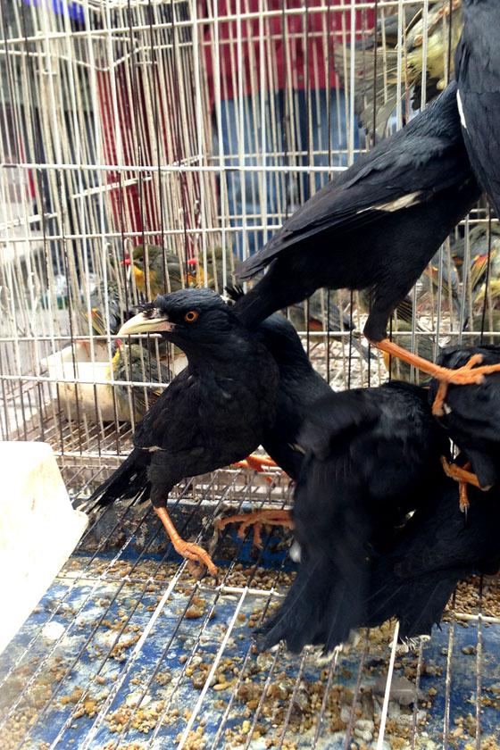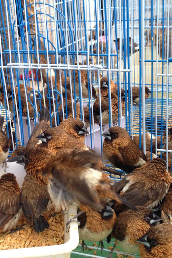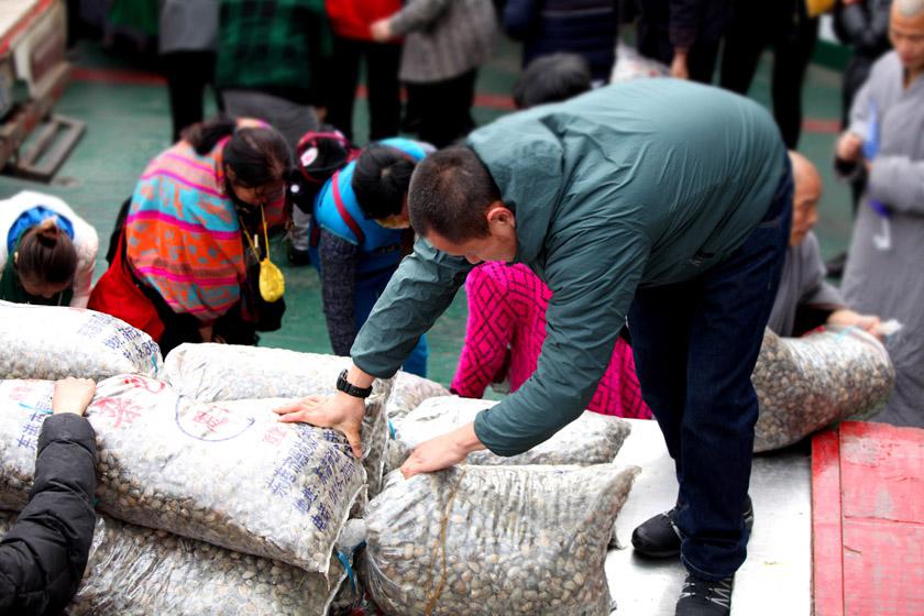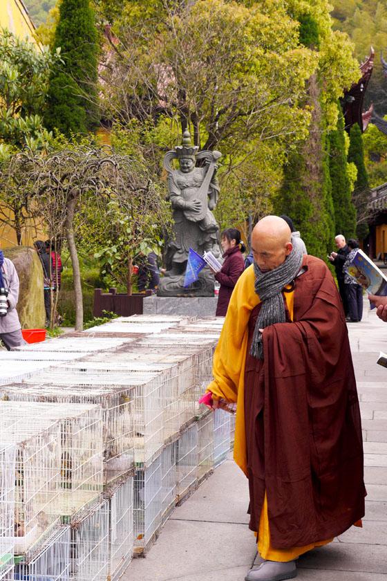 三圣殿前广场,有几十只大鸟笼,里面的鸟雀叽叽喳喳地叫着,期盼即将来临的解脱与自由。大者如八哥,小者如麻雀,上下扑腾,激动欢喜。山门外,有两卡车水族,静静卧在泡沫盒里,畅想海的味道。