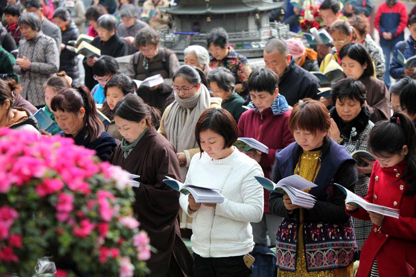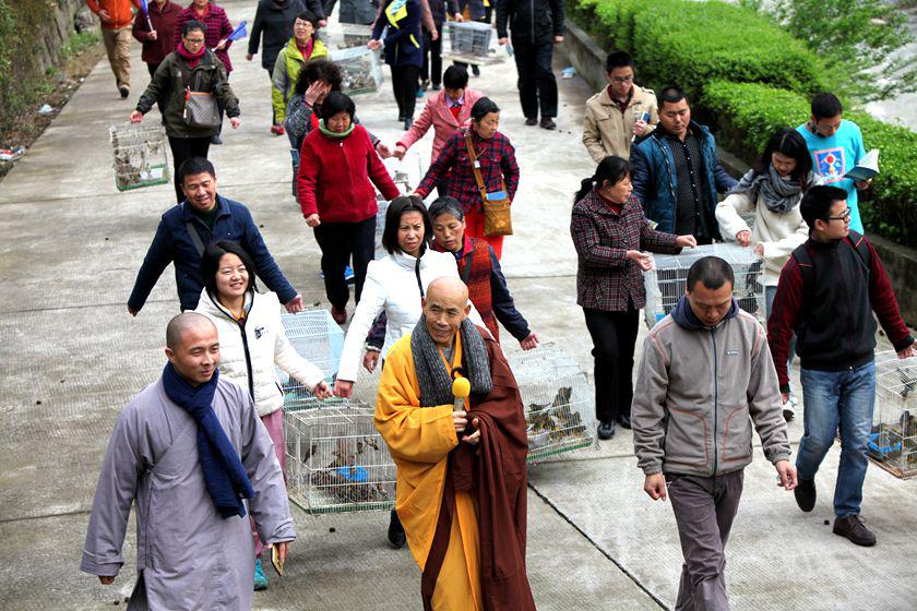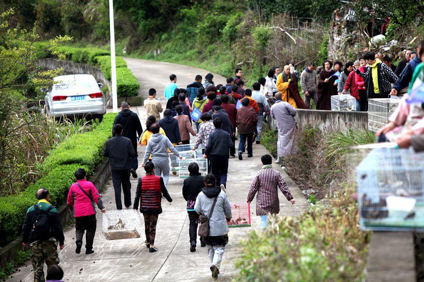 念完放生仪轨后,百余信众兴高采烈地提着鸟笼,向后山赶去,为鸟儿觅得一清净住处。