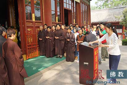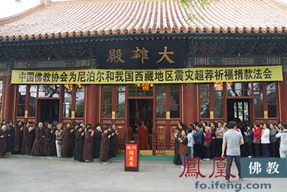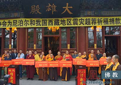 中国佛教协会在北京广济寺举行“中国佛教协会为尼泊尔和我国西藏地区震灾超荐祈福捐款法会”。(图片来源:凤凰佛教)