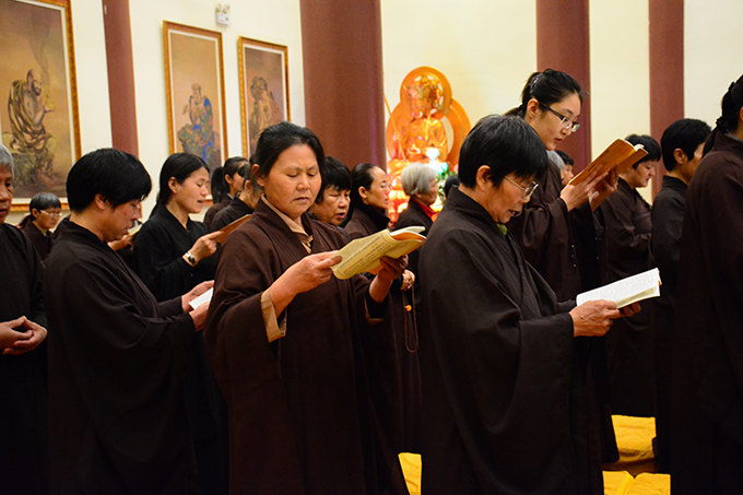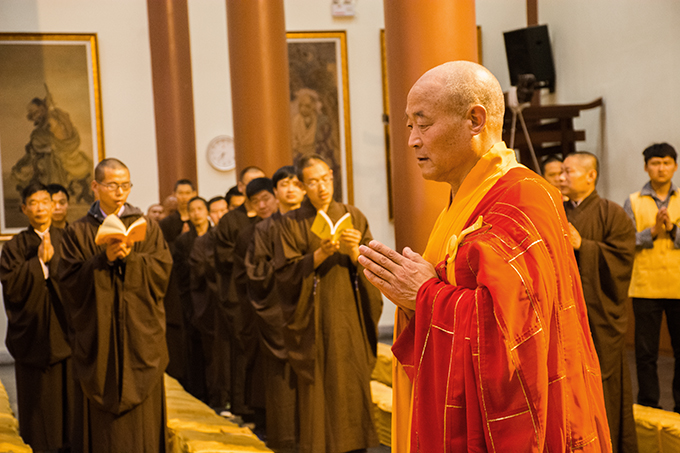 晚六时半,在首座悲如法师的主法下,法会正式开始。伴随着维那法照法师的领唱,一曲清净出尘的《炉香赞》拉开了法会的序幕。霎时间,钟磬悦耳,梵唱清扬,摄人至深的经声佛号回旋于佛堂内外。